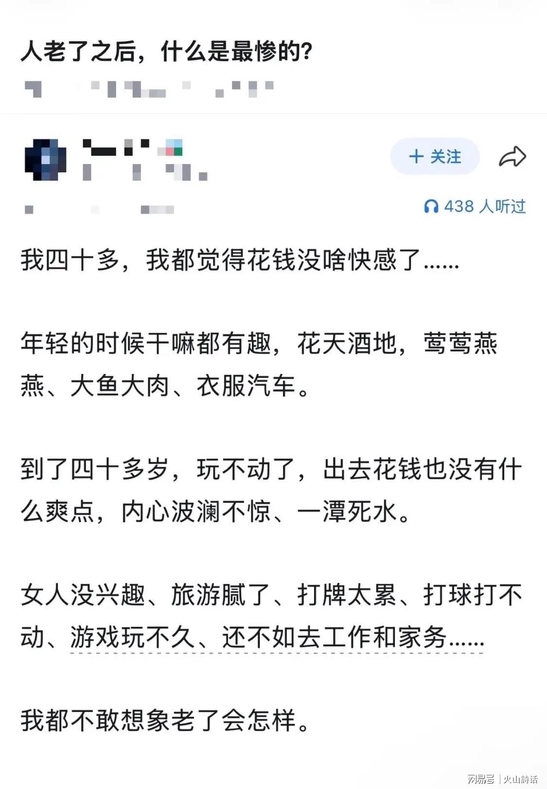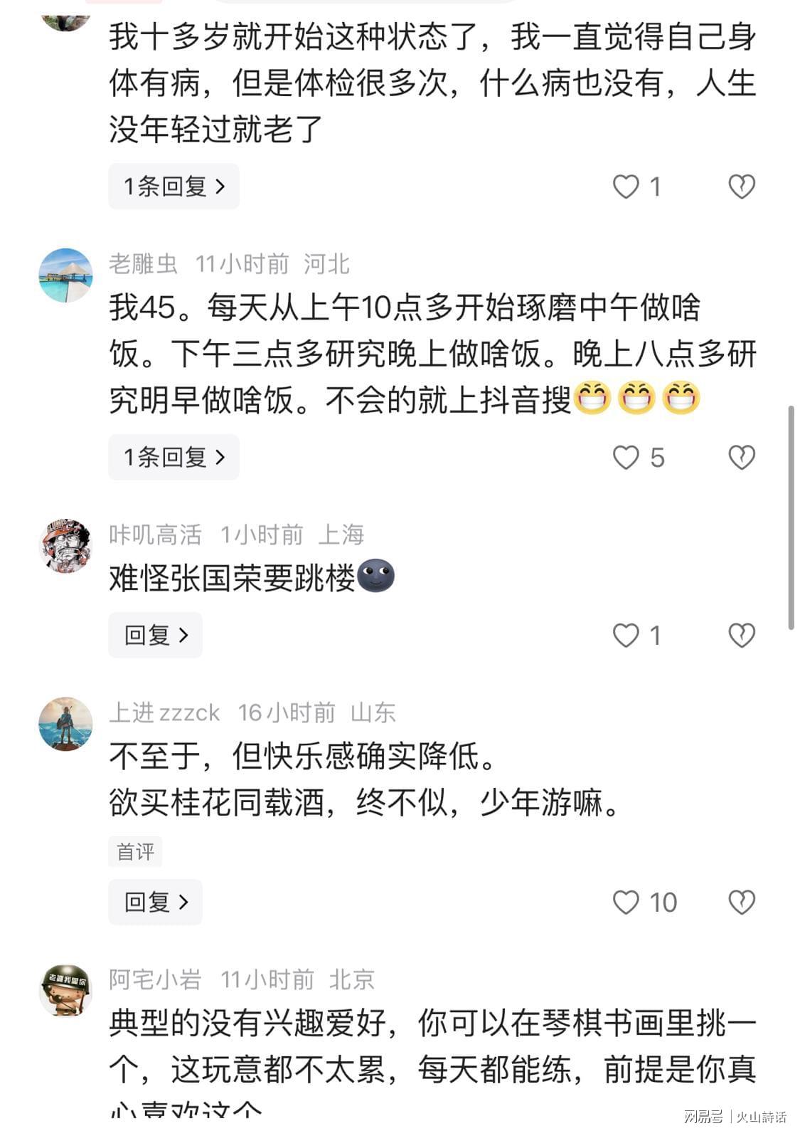 • 不得不说,这位四十多岁网友的感慨,看似无病呻吟,却道破了很多人中年以后的真实困境:人老了最惨的,不是没钱没病,而是对一切都失去了兴趣,活着只剩麻木。